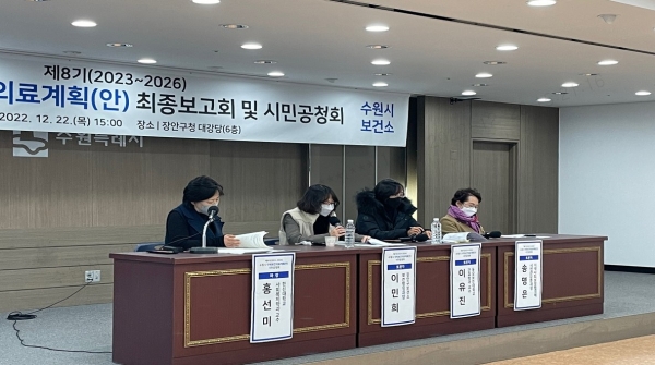 이날 보고회·공청회는 제8기 수원시 지역보건의료계획 주요 내용 보고 지정 토론, 참여자 의견 청취, 질의응답 등으로 진행됐다.