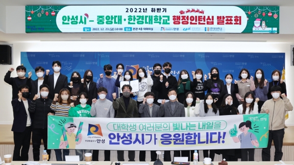 [금요저널] 안성시는 지난 23일 공무원 7명과 학생 23명이 참여한 가운데 시청 대회의실에서 ‘2022년 하반기 안성시–중앙대·한경대학교 행정인턴십 발표회’를 개최했다.
