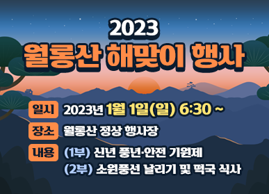 월롱산 해맞이 행사는 코로나19로 인해 3년 만에 열리는 행사로 신년 풍년·안전기원 제례를 시작으로 ‘소원을 실은 친환경 풍선 날리기’가 진행된다.