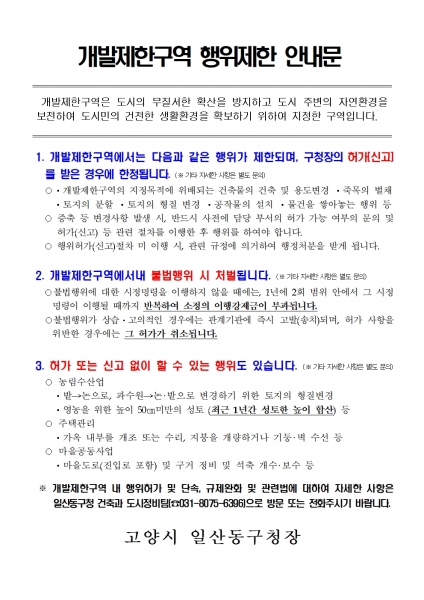 [금요저널] 고양특례시 일산동구는 개발제한구역의 무질서한 난개발 방지와 자연환경 보전을 통해 시민의 건전한 생활환경과 국토의 쾌적한 보존을 위해 개발제한 구역 내 행위제한에 대한 홍보를 강화한다고 밝혔다.