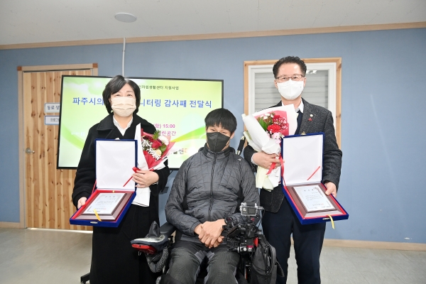 이번 감사패는 파주자유로장애인자립생활센터에서 2021년부터 2022년까지의 회의록, 조례 발의 사항 등 의정활동 모니터링을 통해 장애인 복지 정책에 많은 관심과 지지를 보인 의원을 선정해 수여했다.