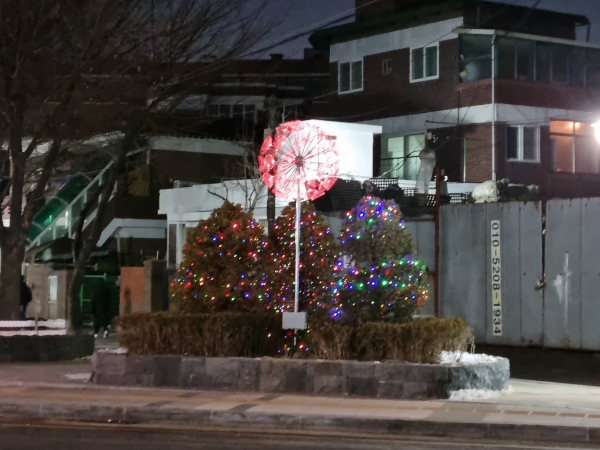맞은편 수봉로 삼거리 근처 화단에는 희망찬 미래를 상징하는 민들레 조명을 설치했으며 나무 주변을 LED조명으로 감쌌다.