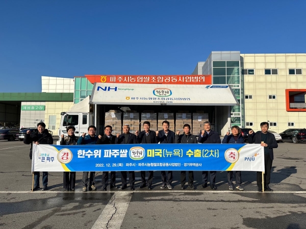 파주시는 29일 파주시농협쌀조합공동사업법인 광장에서 김현철 파주시농업기술센터소장을 비롯해 김영운 파주시농협쌀조합공동사업법인 대표, 권욱민 NH농협 파주시지부장, 각 지역농협 조합장, 한국쌀전업농 파주시연합회장이 자리를 함께해 파주쌀 추가 수출을 기념했다.