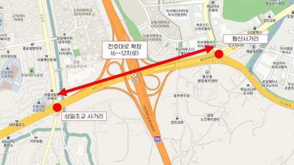 이에 따라 2020년 12월 ‘생태공원사거리 ~ 상일초교 사거리’ 구간이 확장 개통된 후 상일IC 4·5교 이전공사로 지연되고 있던 ‘상일초교 사거리 ~ 황산사거리’ 구간이 30일부터 12차로로 확장 개통하게 됐다.