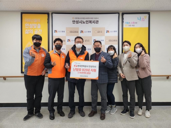 [금요저널] 안성시노인복지관은 한국전력공사 안성지사로부터 ‘따뜻한 겨울나기’ 난방유 929L를 지원받아, 난방유 전달식을 지난 29일 진행했다고 밝혔다.