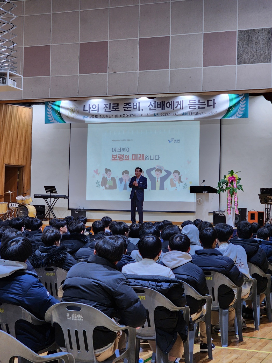 만남의 시간은 본교 제17회 선배인 김동일 보령시장과 제37회 선배인 장동혁 의원이 방문하여 대천고등학교 큰별관에서 2, 3학년 학생들에게 편하게 이야기를 듣고 나누는 방식으로 진행되었다.