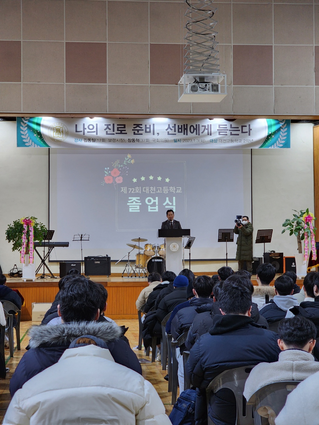 먼저 3학년 후배들을 위해 방문한 장동혁 의원은‘인생은 길다’와‘인생은 속도보다는 방향이 중요하다’와 같이 쉽고 간결한 문장과 주제를 사용하여 조언을 전했다. 뒤에 방문한 2학년은 김동일 보령시장은 처음에 노래를 불러 후배들의 긴장을 풀어준 다음 미래를 위해 열심히 준비하여 자신과 내 가정, 내 고장, 내 나라를 위해 봉사하는 큰별이 되기를 바란다고 당부하는 등 보령시장이자 대천고 선배로서 후배들을 위한 충심어린 조언을 아끼지 않았다.