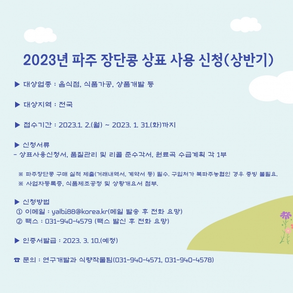 상반기 파주장단콩 상표사용 신청 대상은 2023년 상반기 인증 기간이 만료되는 43개소 및 파주장단콩 상표 사용과 전문점 지정을 희망하는 신규 업체로 파주장단콩을 원료로 사용하는 음식업 및 가공업 등을 운영하는 업체여야 한다.
