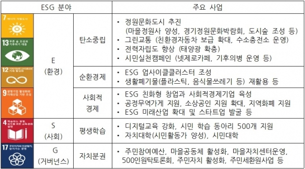 광명시 ESG는 주요 시정에 ESG를 연계하는 방안으로 탄소중립과 양극화 해소 공동체 활성화를 위한 5대 분야 집중 추진 지역기업에 대한 글로벌 표준에 맞춘 ESG 경영 도입 지원 생활 속에서 실천할 수 있는 ESG 교육 강화로 요약할 수 있다.