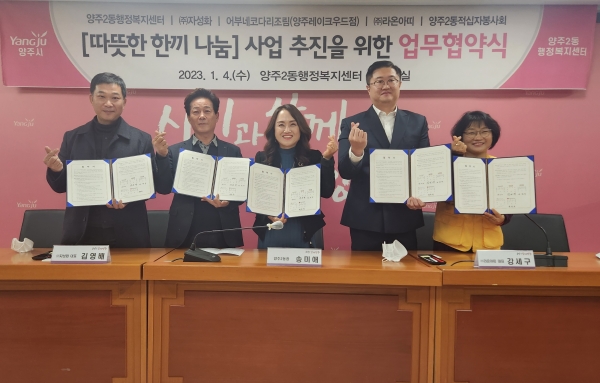 [금요저널] 양주시 양주2동 행정복지센터는 지난 4일 자성화, 어부네코다리조림 양주레이크우드점, ㈜라온아띠, 양주2동 적십자봉사회와 ‘따뜻한 한끼 나눔’사업 추진을 위한 업무협약을 체결했다고 밝혔다.