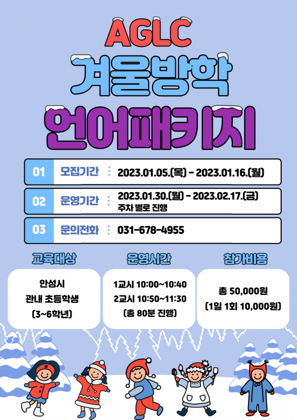 [금요저널] 안성시세계언어센터는 오는 1월 30일부터 2월 17일까지 총 3주간 ‘겨울방학 언어패키지 캠프’를 진행한다.