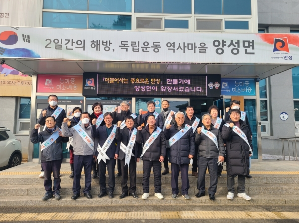 이걸필 양성면장은 “추운 날씨에도 ‘내 집·내 점포 앞 눈 스스로 치우기’ 캠패인에 참여해주신 방위협의회 위원님들과 적극적인 호응을 보여준 점포 관계자 및 주민 여러분께 감사드린다”며 “주민의 불편을 최소화하고 안전을 도모하는 일이므로 수고스럽더라도 내 집 앞, 내 점포 앞은 스스로 제설해 주시기를 다시 한번 부탁드린다”고 말했다.