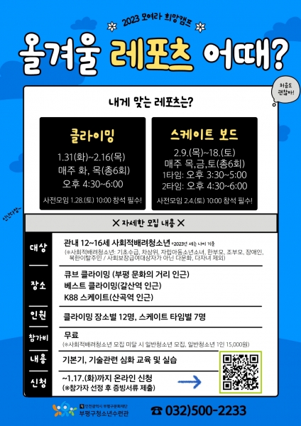 [금요저널] 부평구 청소년수련관이 오는 17일까지 2023 모여라희망캠프 ‘올겨울 레포츠 어때?’ 참가자를 모집한다.