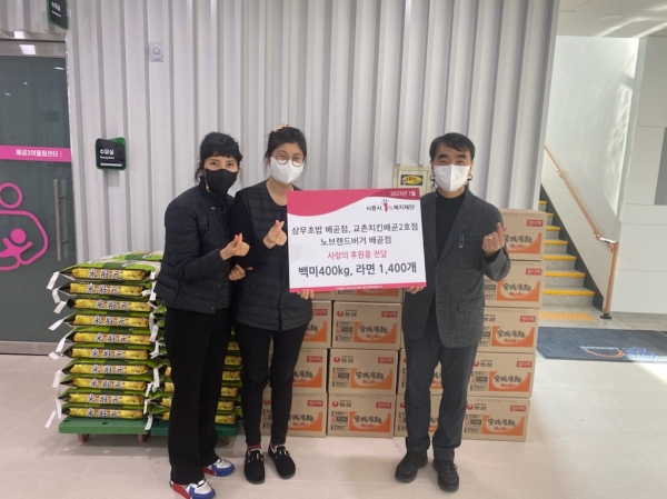 지난 9일 상무초밥 배곧점, 노브랜드버거 배곧점, 교촌치킨 배곧2호점이 배곧2동에 백미 400kg, 라면 35상자를 후원했다.