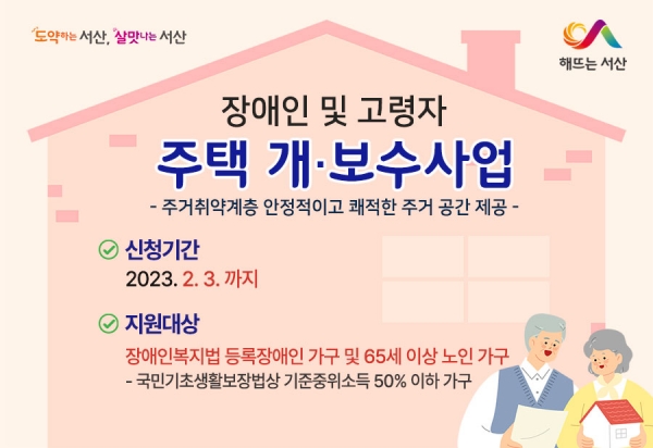 [금요저널] 충남 서산시는 주거 취약계층 가구를 대상으로 노후된 주택 개·보수 비용을 지원하는 ‘장애인 및 고령자 주택 개·보수사업’ 신청을 2월 3일까지 신청받는다고 12일 밝혔다.
