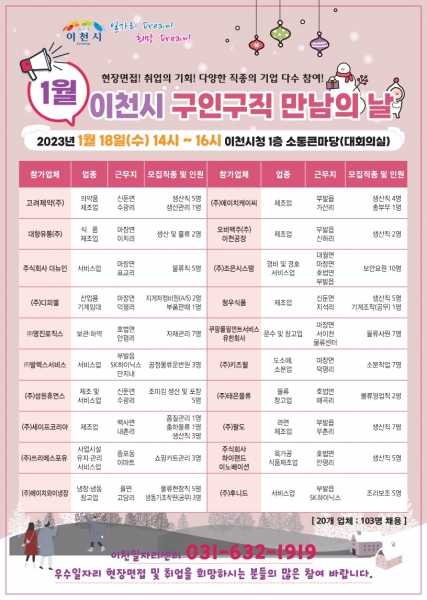 이천시청 1층 소통큰마당에서 진행되는 ‘구인구직 만남의 날’ 행사는 20개의 다양한 직종의 중소기업이 다수 참여해 103명을 채용할 예정이며 오후 2시~ 4시까지 2시간동안 진행된다.