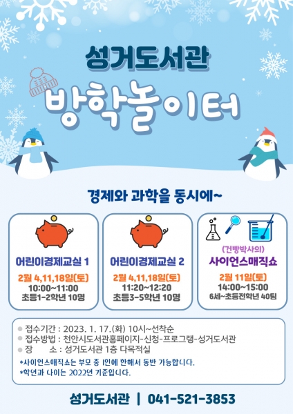[금요저널] 천안시 성거도서관이 겨울방학을 맞아 ‘성거도서관 방학놀이터’를 운영한다고 13일 밝혔다.