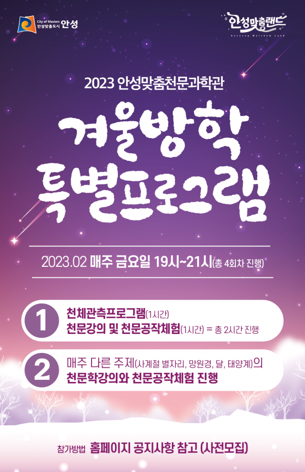 겨울방학 특별프로그램 참여는 안성맞춤천문과학관 홈페이지 공지사항을 참고하면 되며 이메일로 사전모집 진행 중이다.