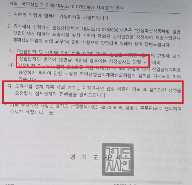 한편 안성시는 지난 2020년 축산식품복합산업단지에 대해 경기도 지방산업단지계획심의위원회에 심의를 요청했으나 “재심의”판정이 나왔고, 이후 안성시는 심의요청을 하지 않았었다.