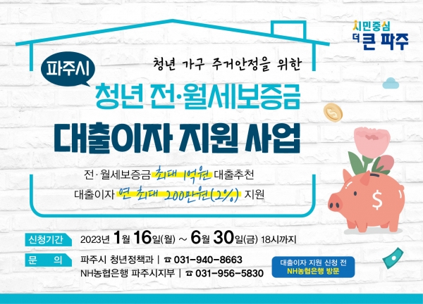 청년 취업자 월세지원 사업은 파주시 중소기업 관내 재직자 자격기준을 없애고 파주시 거주자로 확대했으며 전세보증금 대출이자 지원 사업은 전세임차보증금에서 전·월세 임차보증금으로 확대하고 임차 주택기준을 3억원 이하로 상향해 추진한다.