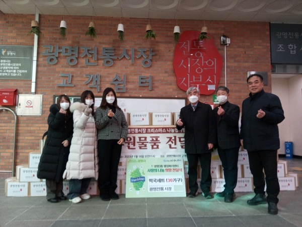광명전통시장은 시장 내 휴게공간에 설치된 크리스마스 나눔엽서로 후원받은 기부금으로 11년째 어려운 이웃을 위해 후원물품을 전달해 오고 있다.