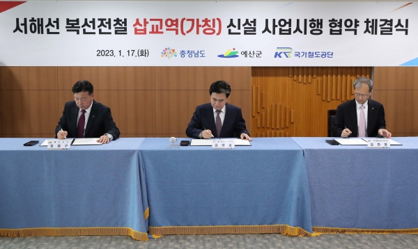김태흠 지사는 17일 도청 상황실에서 최재구 예산군수, 김한영 국가철도공단 이사장과 ‘서해선 복선전철 삽교역 신설 사업 시행 협약’을 체결했다.