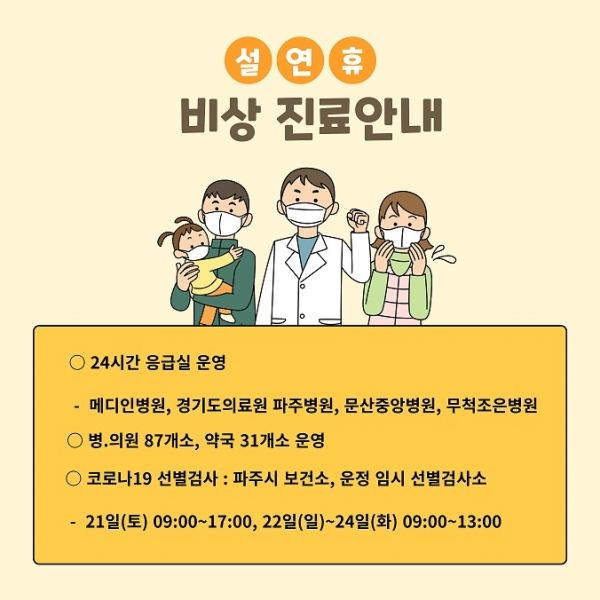 지역 내 지역응급의료기관인 메디인병원, 응급의료시설인 경기도의료원 파주병원, 문산중앙병원, 무척조은병원 등 4곳은 24시간 응급실을 운영해 비상진료체계를 유지하고지역 내 병·의원 87개소와 약국 30개소도 연휴 기간에 운영된다.