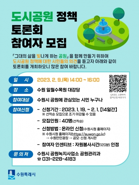 [금요저널] 수원시가 2월 9일 오후 2시 일월수목원 강당에서 열리는 ‘2023년 도시공원 정책토론회’에 참여할 시민 40명을 19일부터 선착순으로 모집한다.