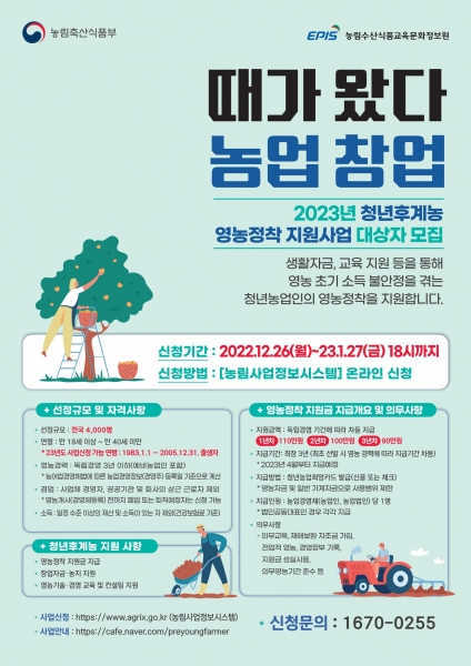 사업 신청은 오는 27일 오후 6시까지 농림사업정보시스템을 통해 온라인으로 직접 신청해야 하며 이후 서류평가와 면접평가를 거쳐 3월 말에 최종 대상자를 선발한다.