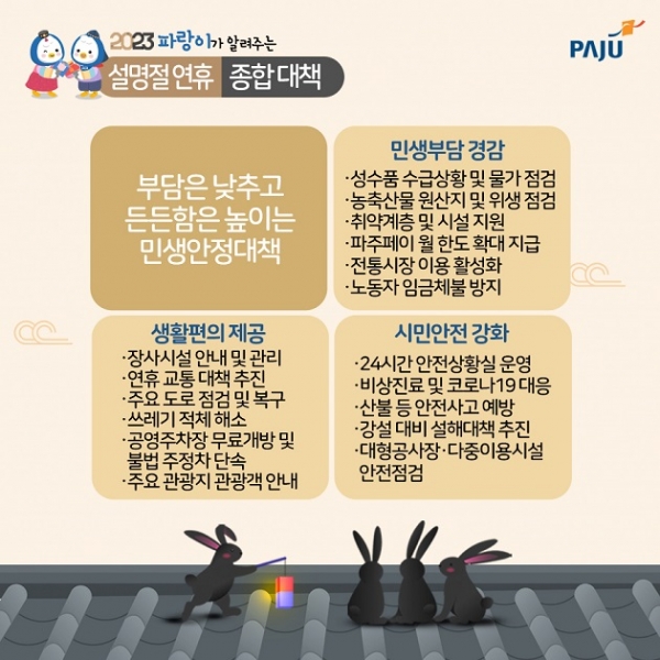 [금요저널] 파주시는 시민들의 ‘더 안전하고 더 따뜻한 설 명절 연휴’를 위해 연휴기간인 1월 21일부터 24일까지 ‘2023년 설 연휴 종합대책’을 추진한다.