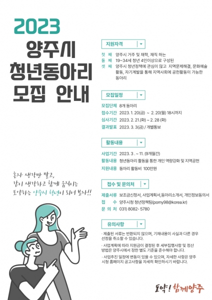 [금요저널] 양주시는 오는 2월 20일까지 ‘2023년 청년동아리 지원사업’에 참여할 청년동아리 8팀을 모집한다.