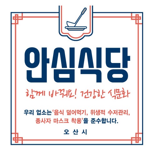[금요저널] 경기 오산시는 위생적이고 안전한 식사문화 보급 확산과 더불어 시민들이 안심하고 식당을 이용할 수 있도록 생활 방역 3대 실천 과제를 준수하는 식당을 ‘안심식당’으로 지정해 운영할 계획이라고 밝혔다.
