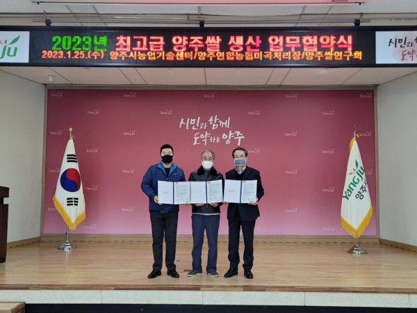 [금요저널] 양주시 농업기술센터는 지난 25일 농업기술센터에서 최고급 양주쌀을 안정적으로 생산하기 위해 양주연합농협미곡종합처리장, 양주시쌀연구회와 3자 간 업무협약을 체결했다.