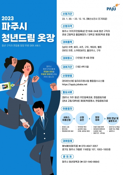 파주시 ‘청년드림 옷장’ 사업은 청년 취업준비생에게 면접정장을 무료로 대여해 주는사업으로 미취업 청년구직자의 취업 준비를 위해 2020년 4월부터 실시하고 있다.