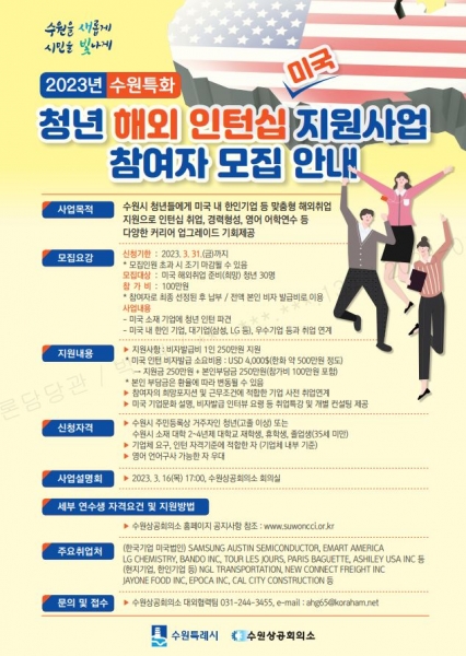 청년 해외 인턴십 지원사업은 미국 소재 기업에 수원청년을 인턴으로 파견하는 사업이다.