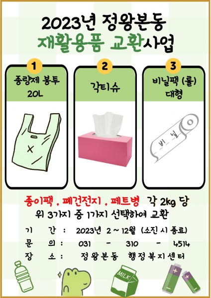 [금요저널] 정왕본동 행정복지센터는 오는 2월부터 재활용품을 모아오면 종량제봉투, 각티슈, 비닐팩 중 한 가지를 선택해 교환하는 사업을 추진하기로 했다.