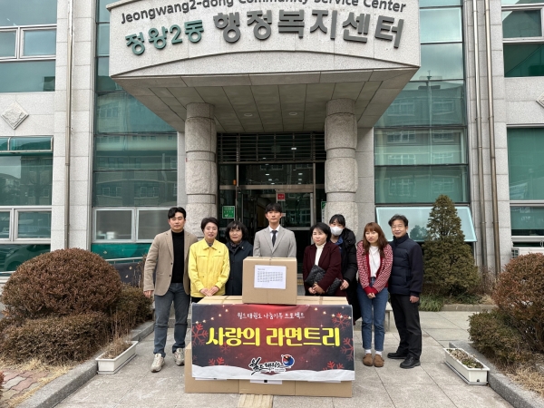 [금요저널] 정왕2동에 소재한 용인대 월드태권도는 지난달 31일 라면 총 675봉으로 구성한 ‘사랑의 라면트리’를 정왕2동 행정복지센터에 기탁하며 온정의 손길을 전했다.