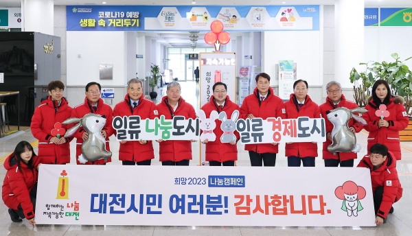 [금요저널] 대전사회복지공동모금회는 1일 시청 1층에 설치된 온도탑 앞에서 이장우 대전시장, 이상래 대전시의회의장, 설동호 교육감, 정태희 대전사회복지공동모금회장 등 20여명 참석한 가운데 희망2023 나눔 캠페인 폐막식 행사를 개최했다.