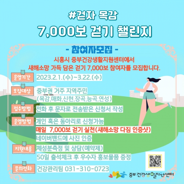 이처럼 건강관리에 필수인 걷기의 중요성이 커지는 만큼, 시는 걷자 목감 7,000보 챌린지를 2월 1일부터 3월 22일까지 50일간 진행해 지역주민이 건강한 일상을 가꿀 수 있도록 돕는다.