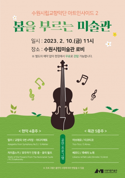 [금요저널] 경기도 수원시 수원시립미술관 미술관과 행궁동을 찾는 시민들에게 문화 향유의 기회를 확대하고자 수원시립교향악단의 찾아가는 실내악 연주회 아트인사이드 미술관편 ‘봄을 부르는 미술관’을 2월 10일 11시 수원시립미술관 로비에서 개최한다.