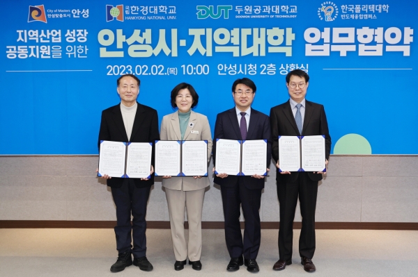[금요저널] 2월2일 안성시 · 국립한경대학교 · 두원공과대학교 · 한국폴리텍대학 반도체융합캠퍼스는 안성시 반도체산업 성장을 위한 업무협약을 체결했다 협약의 내용은 지역산업의 환경변화 및 산업수요에 공동 대응하고 기관 간 인적·물적 협력체계를 구축해 맞춤형 인력양성을 주요 골자로 하고 있으며 고부가가치 창출을 위한 기업지원 프로그램 개발 미래혁신 인재 양성을 위한 산학연 연계 협약기관 보유 인프라 공유, 경쟁력 강화 관련사업 추진 등의 내용을 포함한 것으로 알려졌다.