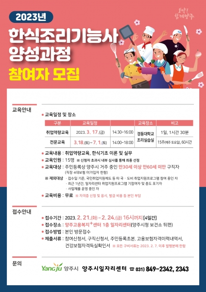 양주시일자리센터,‘2023년 한식조리기능사 양성과정’참여자 모집