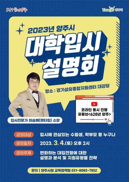 [금요저널] 양주시는 오는 3월 4일 경기섬유종합지원센터 대강당에서 2024학년도 대학입시의 이해를 돕기 위해 ‘2023년 제1차 대학입시설명회’를 개최한다.