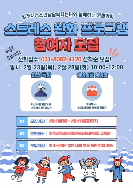 [금요저널] 양주시청소년상담복지센터는 6일부터 오는 17일까지 관내 청소년을 대상으로 진행하는 겨울방학 집단상담‘스트레스 완화 프로그램’참가자를 모집한다고 밝혔다.
