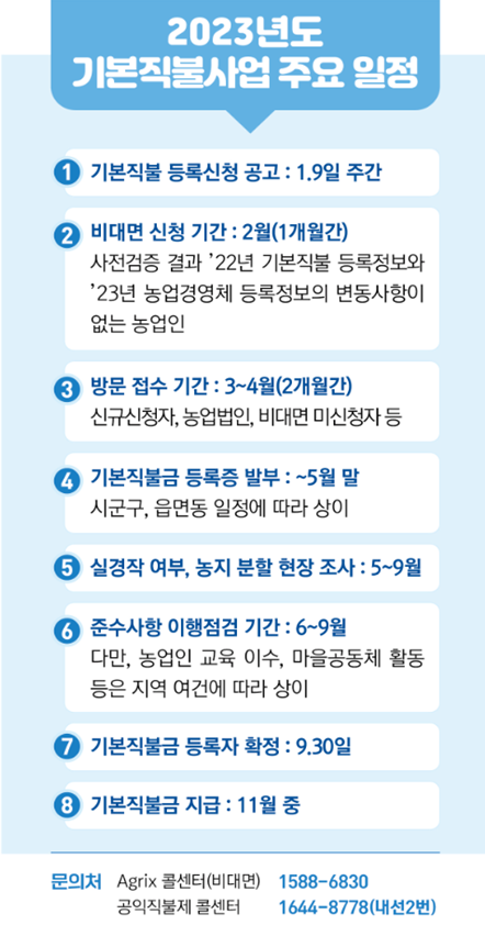 지난해 공익직불금 등록정보와 올해 농업경영체 등록정보가 동일한 농업인이 대상이며 스마트폰과 PC, ARS를 통해 신청할 수 있다.