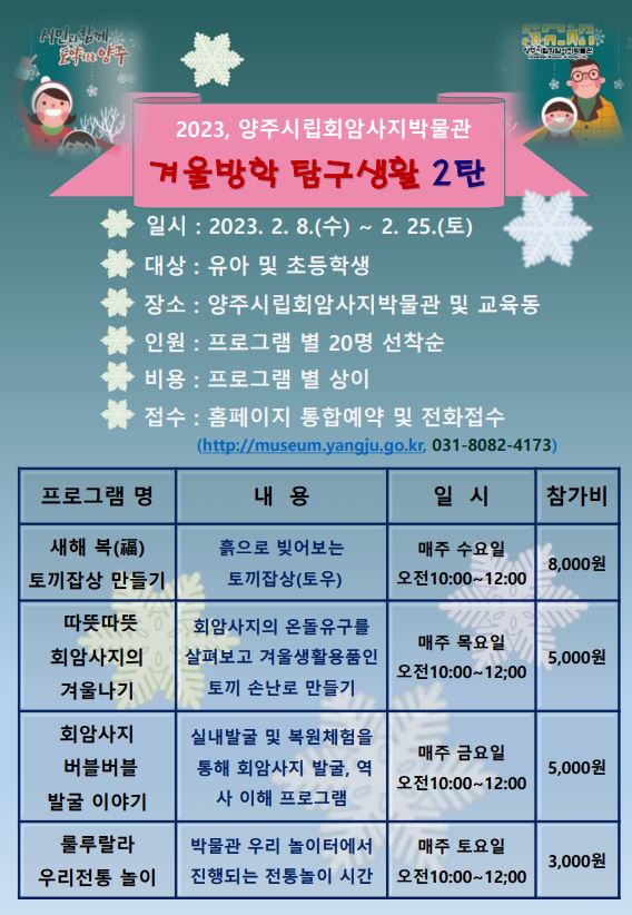 [금요저널] 양주시립회암사지박물관은 오는 8일부터 25일까지 관내 유아와 초등생을 대상으로 겨울방학 특별프로그램 ‘겨울방학 탐구생활’ 2탄을 운영한다고 밝혔다.