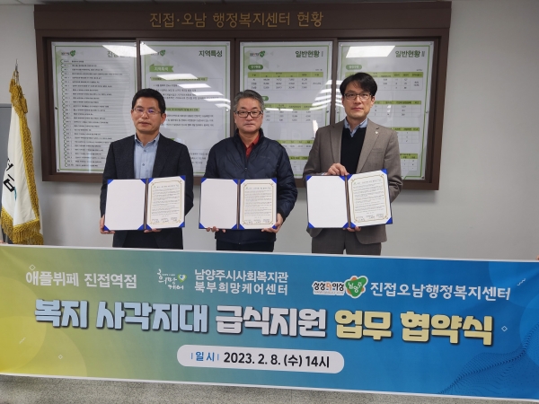 [금요저널] 남양주시 진접오남행정복지센터는 지난 8일 북부희망케어센터 및 애플뷔페 진접역점과 함께 지역의 소외된 이웃의 돌봄 체계를 구축하기 위해 업무협약을 체결했다.