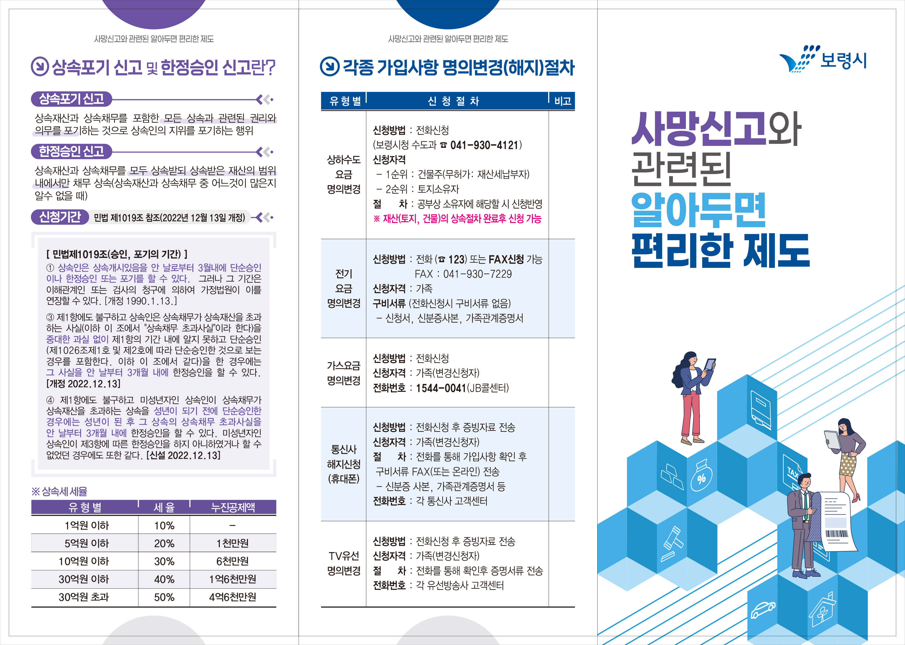 특히 상속포기 신고 및 한정승인 신고의 주요 개정내용과 사망신고 이후 수반되는 상하수도·전기·가스 요금 등 각종 가입사항 명의변경·해지 절차까지 담아 시민들이 주요 정보를 쉽게 확인할 수 있도록 했다.