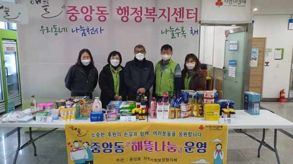 중앙동 지역사회보장협의체 특화사업인‘해뜰나눔’은 생계에 어려움을 겪고 있는 저소득층 이웃들을 초대해 다양한 생필품, 식료품 중에서 필요한 것들만 골라갈 수 있게 한다.