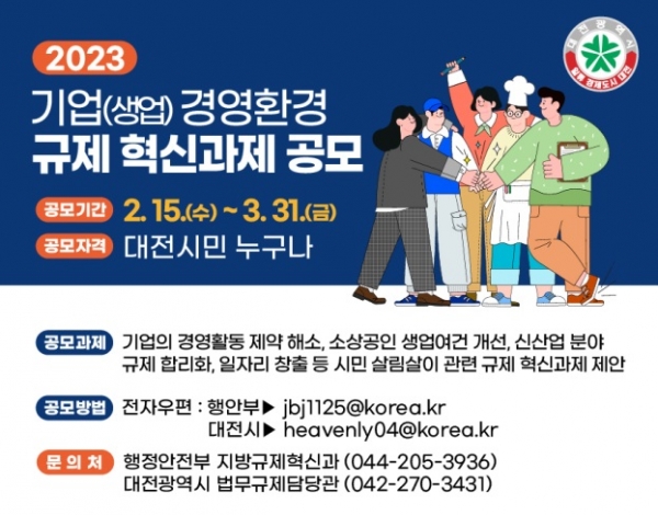 [금요저널] 대전시는 행정안전부와 공동으로 오는 2월 15일부터 3월 31일까지 ‘2023년 기업 경영환경규제 혁신과제’를 공모한다고 밝혔다.